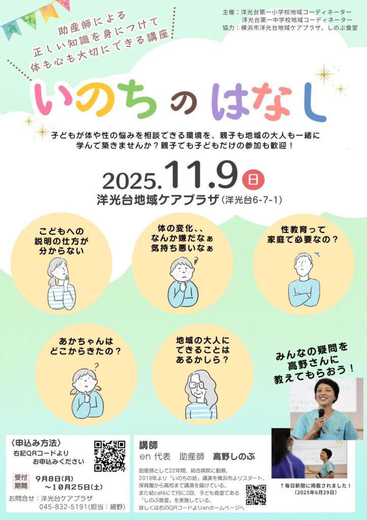 2025年11月15日(土)関内ホールで大人のためのいのちの話を講演します。ぜひお母さんだけでなく、お父さんもご参加ください!