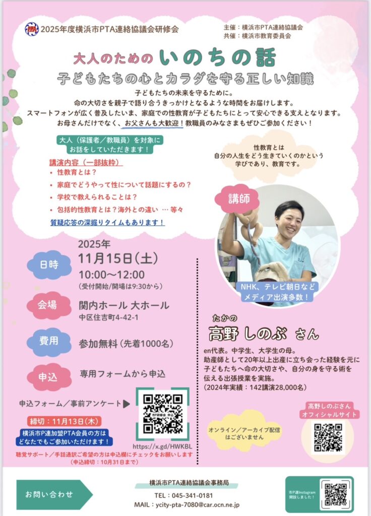 2025年10月1日 / 最終更新日 : 2025年10月1日 seikyoiku お知らせ 11/15 関内ホール大ホールで「大人のためのいのちの話」を講演します 2025年11月15日(土)関内ホールで大人のためのいのちの話を講演します!ぜひお母さんだけでなくお父さんもご参加ください! Follow me! FacebookXBlueskyHatenaCopy コメントを残す コメントをキャンセルメールアドレスが公開されることはありません。 ※ が付いている欄は必須項目ですコメント ※ 名前 ※ メール ※ サイト 次回のコメントで使用するためブラウザーに自分の名前、メールアドレス、サイトを保存する。